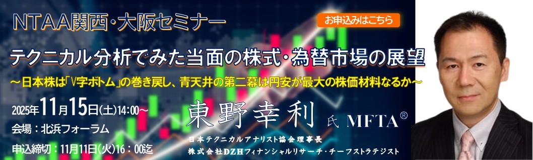 新着情報 お知らせ 2025/10/10 【11/15(土)!関西大阪セミナー】テクニカル分析でみた当面の株式・為替市場の展望 講師:東野... 2025/09/09 IFTA2025フランクフルト(9/26-28)ストリーミングチケットの申し込みについて 2025/08/15 【NTAA会員向け】Technical Analysts Journal 2025の 最新刊が掲... 受講・受験案内 2025/09/01 2025年テクニカルアナリスト国際資格 第2次資格試験受験申込 WEBINAR&リアルセミナー 2025/10/07 【11/28(金)!開催】ヒゲは語る―AIが読み解く市場のささやき 講師:尹煕元氏 2025/09/29 【10/31(金)!開催】パターン分析から見たマーケット動向 講師:高橋幸洋氏 2025/08/21 【10/24(金)!開催】当面のテクニカル需給の注目点 講師:三浦豊氏 過去の記事・お知らせを見る セミナー情報 2024年4月のセミナー/参加申込 04月19日【 会員限定WEBINAR&リアルセミナー】今さら聞けない基本の基本 -チャートだけで相場の先行きを予想する-講師:古城鶴也氏 04月25日【会員限定WEBINAR】「日経平均4万円」後の世界~エリオット波動からの見通し~」講師:宮田直彦氏 日 月 火 水 木 金 土 123456 78910111213 14151617181920 21222324252627 282930 各種リンク お問い合わせ/入会申し込みこちらをクリックしてください 会員の方向け Myページこちらをクリックしてください 賛助会員24団体 Supporting member (内2023年6月1日現在バナーをいただいている賛助会員様)五十音順