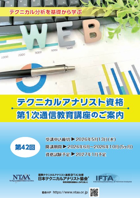 ホーム - 資格制度について - 第1次資格試験 - 第1次通信教育講座パンフレット 資格制度について 第1次資格試験 第1次資格試験について 通信教育テキストの概要 第1次通信教育講座パンフレット 第2次資格試験 第2次資格試験について 通信教育テキストの概要 2026年度第2次通信教育講座パンフレット 第2次通信教育講座(例題) 第3次資格試験 IFTA MFTAの応募について 応募要項 お申込みの手順 テクニカル分析 先行研究論文 資格表記記載例 テクニカルアナリスト資格 第42回 第1次通信教育講座パンフレット ※次回の募集は2026年4月~5月上旬となります。 各種リンク お問い合わせ/入会申し込みこちらをクリックしてください 会員の方向け Myページこちらをクリックしてください