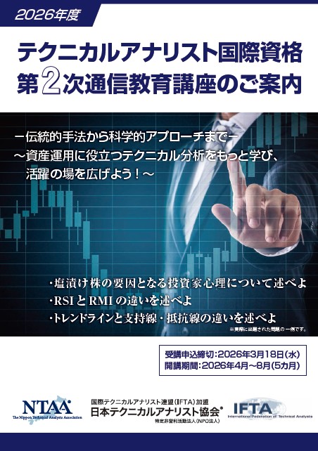 ホーム - 資格制度について - 第2次資格試験 - 2026年度第2次通信教育講座パンフレット 資格制度について 第1次資格試験 第1次資格試験について 通信教育テキストの概要 第1次通信教育講座パンフレット 第2次資格試験 第2次資格試験について 通信教育テキストの概要 2026年度第2次通信教育講座パンフレット 第2次通信教育講座(例題) 第3次資格試験 IFTA MFTAの応募について 応募要項 お申込みの手順 テクニカル分析 先行研究論文 資格表記記載例 各種リンク お問い合わせ/入会申し込みこちらをクリックしてください 会員の方向け Myページこちらをクリックしてください
